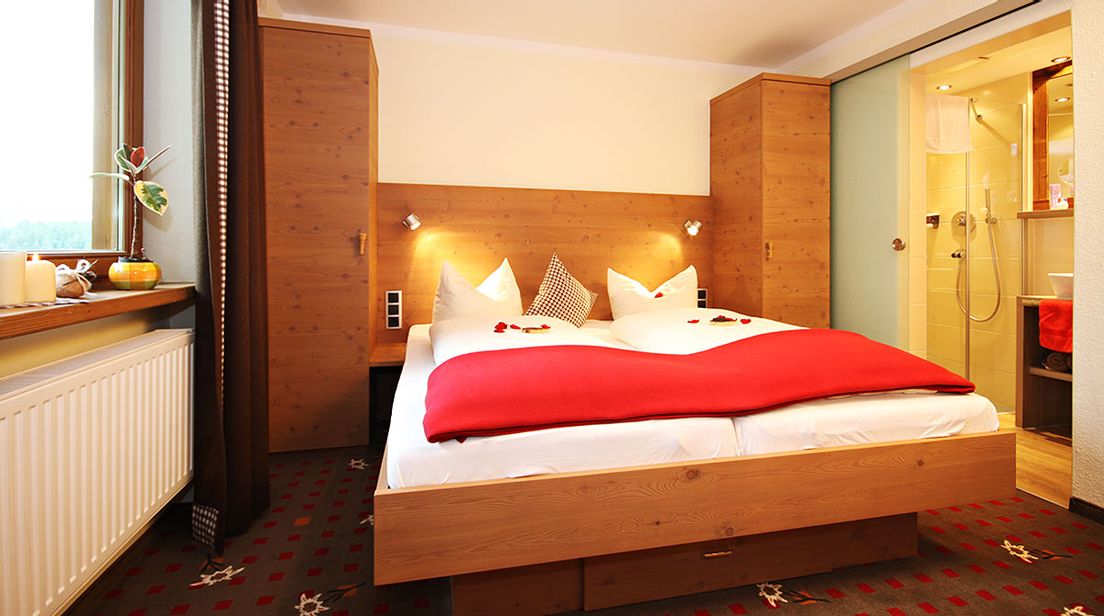 Das kuschelige Doppelzimmer begeistert mit seiner überwiegenden Einrichtung aus Holz. Im hellen Bad ist eine Regendusche. Es gibt eine Sitzgelegenheit mit Tisch.