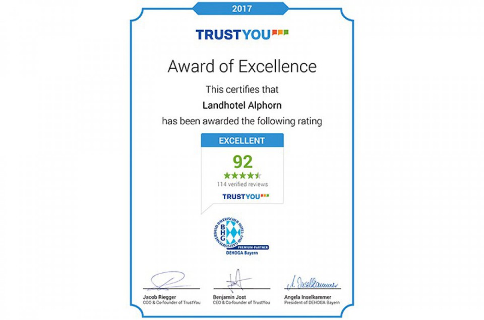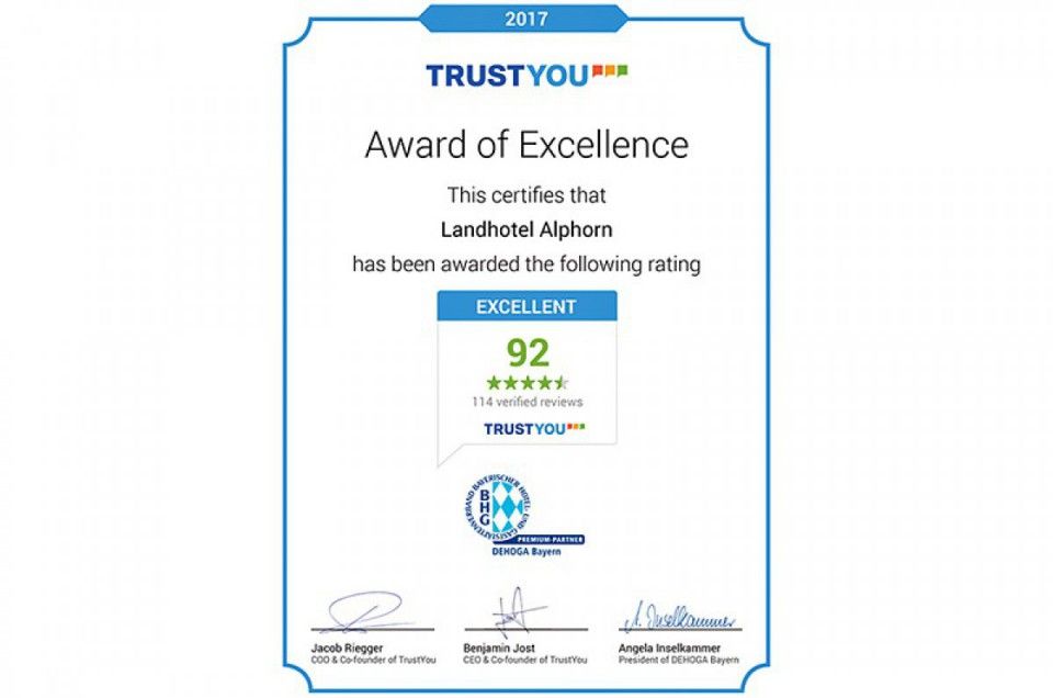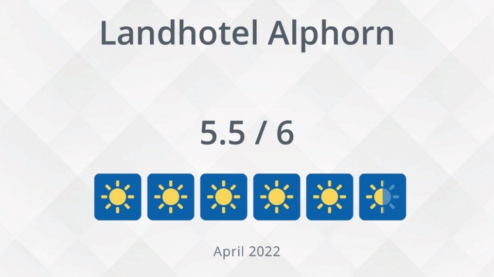 Bei der großen Bewertungsplattform TrustYou hat das Landhotel Alphorn 92 von 100 möglichen Punkten erhalten.