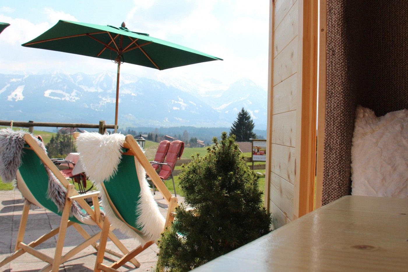 Handwerkliches Geschick? „Haben wir eigentlich beide nicht“, gibt Jörg Pöschel lachend zu. „Aber wir hatten große Lust, das für unsere Gäste zu bauen und haben viel dazu gelernt.“ Die Idee, zwei Häuschen auf der Terrasse vor dem Panorama der Allgäuer Alpenwelt aufzustellen, kam den beiden beim Blättern in einer Zeitschrift. „Wir haben ein Foto von bestuhlten Gewächshäuschen vor einem Restaurant gesehen.“