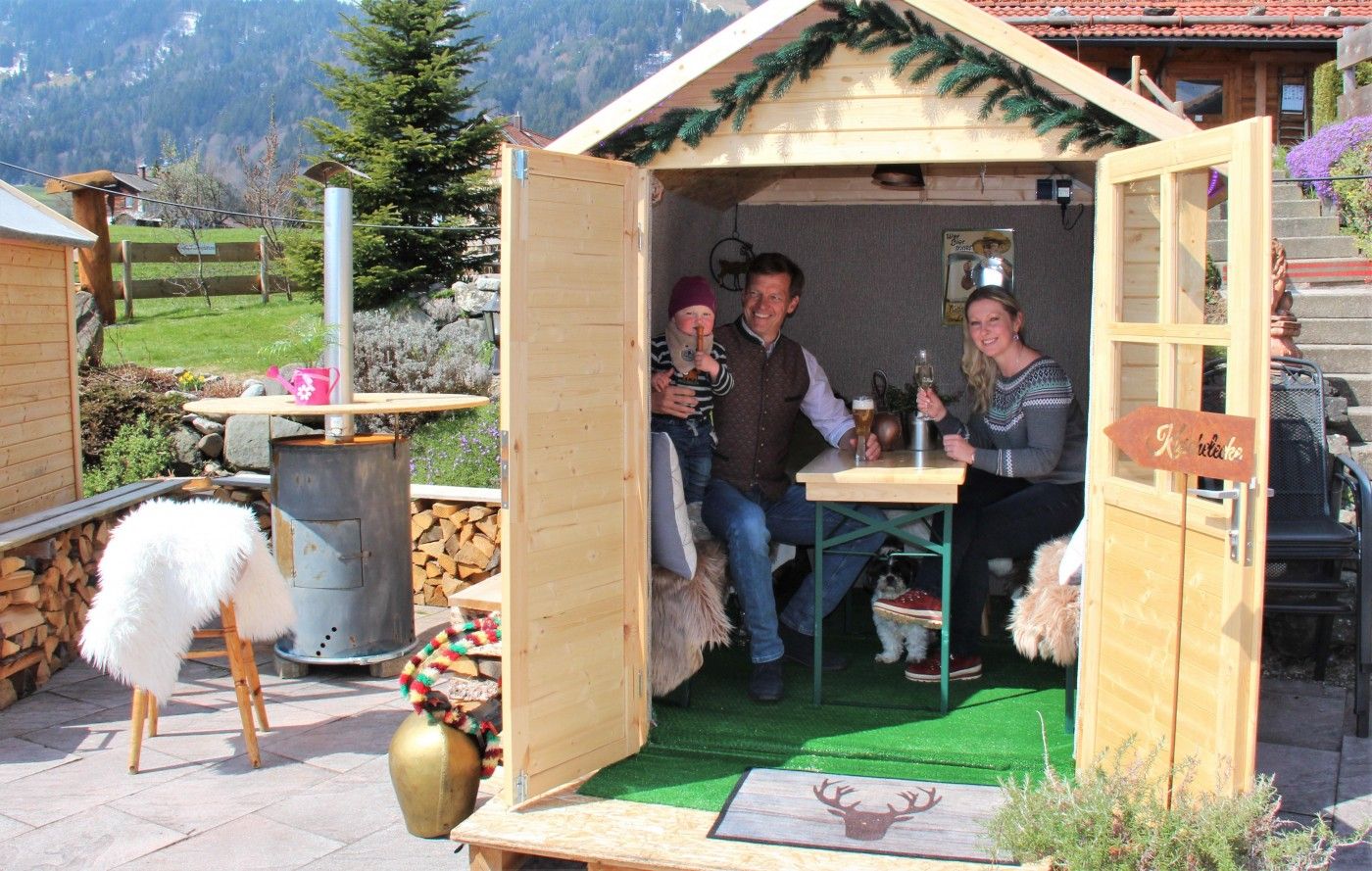 Alles klar – hier bleibe ich. Anschlusstermine? Einfach absagen. Denn: Gemütlicher wird’s nicht. Auf der Terrasse des Landhotels Alphorn in Ofterschwang stehen zwei absolut entzückende, von den Chefs selbstgebaute Hüttchen.